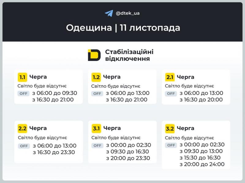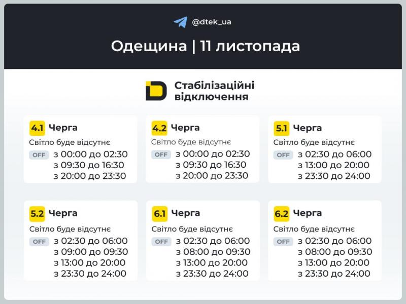 Компанія ДТЕК повідомила, що отримала нові команди від НЕК Укренерго, згідно з якими оновила графіки відключень електроенергії на сьогодні, 11 листопада.