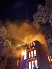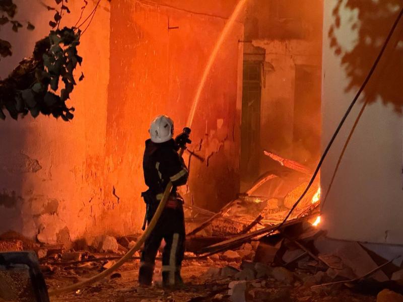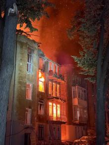 ✔️Постраждали будівлі старого житлового фонду — верхні поверхи знищено, вогонь досі не загашено.