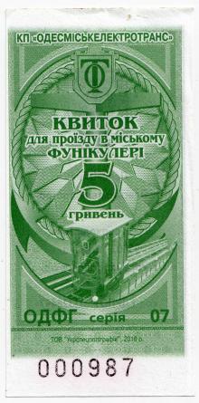 Билет на проезд в городском фуникулере. Цена 5 грн. Одесса. 2018 г.