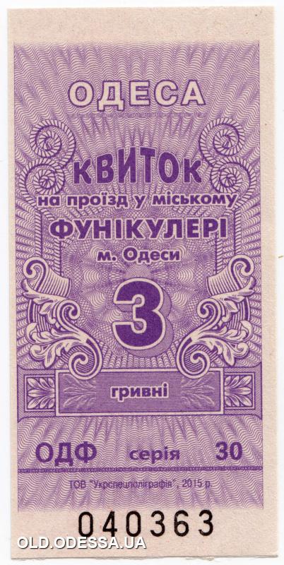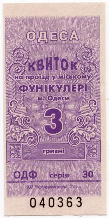 Билет на проезд в городском фуникулере. Цена 3 грн. Одесса. 2015 г.