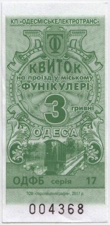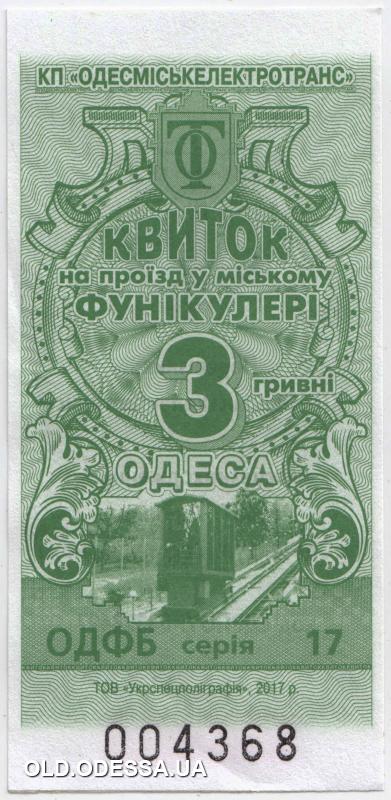 Билет на проезд в городском фуникулере. Цена 3 грн. Одесса. 2017 г.