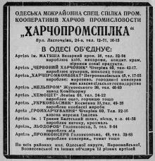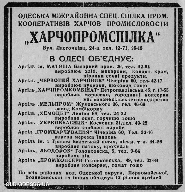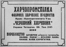 Артіль «Червоний харчовик», Пушкінська, 33, тел. — 30-56, 2-97, цукрово-кондит. фрукт.