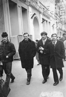 Возле кинотеатра «Комсомолец» на ул. Дерибасовской. На заднем плане вывеска Дома обуви. Одесса. 1973 г.