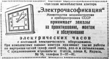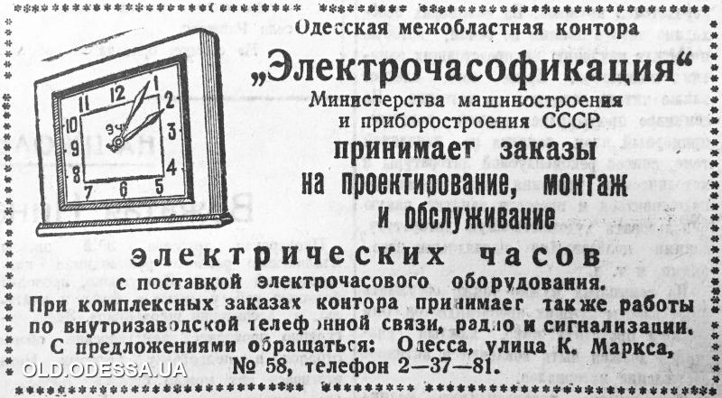 Одесское проектно-монтажное бюро электрочасофикации «Главприбор», ул. Толстого, 13. Тел. 52-15.