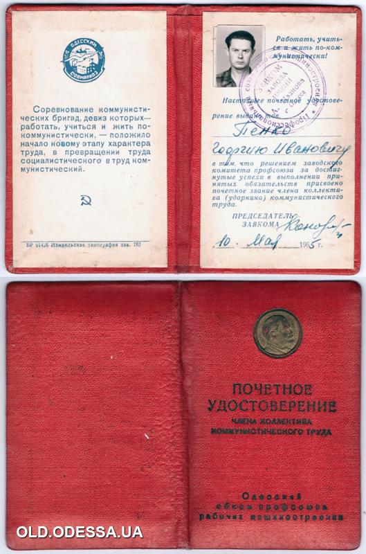 Почетное удостоверение члена коллектива коммунистического труда, выданное Г.И. Пенко заводским комитетом завода им. Иванова. Одесса. 1965 г.