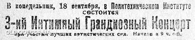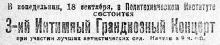 3-й интимный концерт в Политехническом институте. Объявление в одесской газете «Известия» 16 сентября 1922 г.