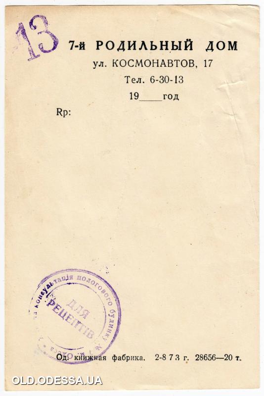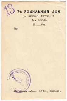 Бланк родильного дома № 7 на ул. Космонавтов, 17. Одесса. 1973 г.