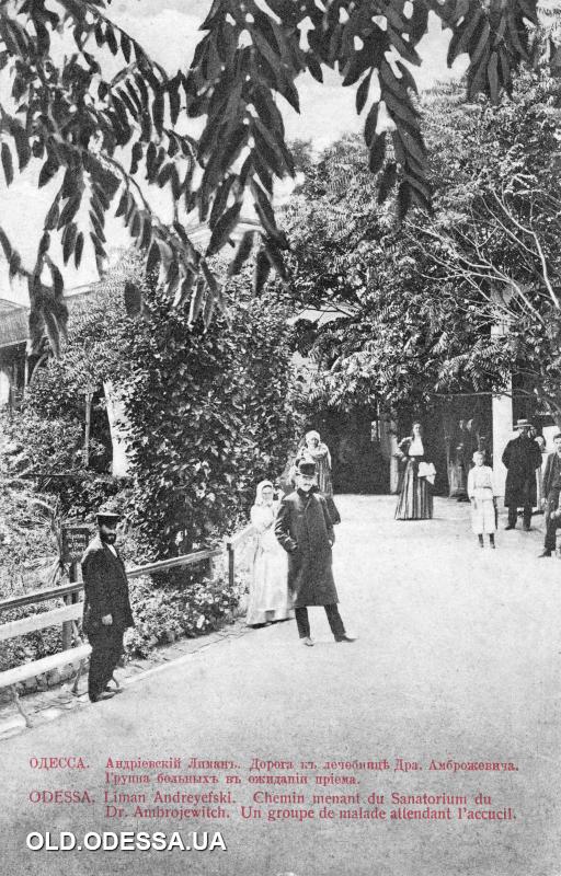 Одесса. Андреевский лиман. Дорога к лечебнице д-ра Амброжевича. Группа больных в ожидании приема. Асседоретфегс. Открытое письмо.