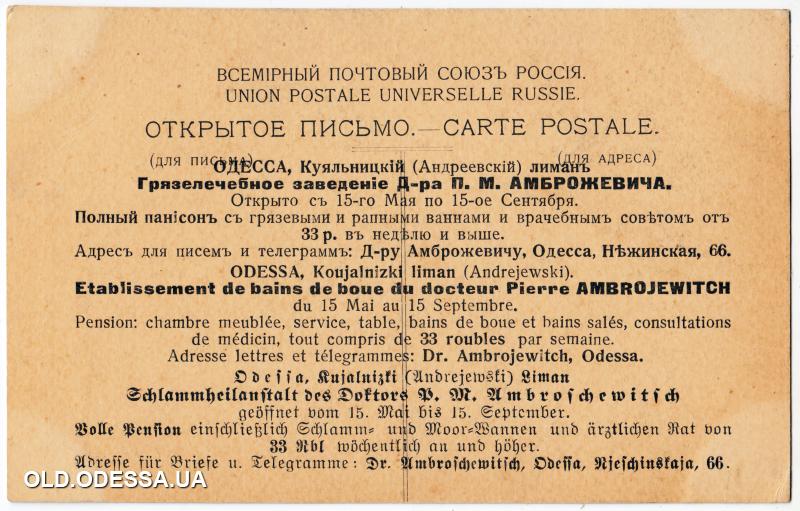 Реклама грязелечебного заведения д-ра Амброжевича в Одессе на Куяльницком (Андреевском) лимане. Открытое письмо.