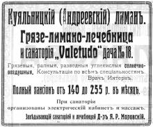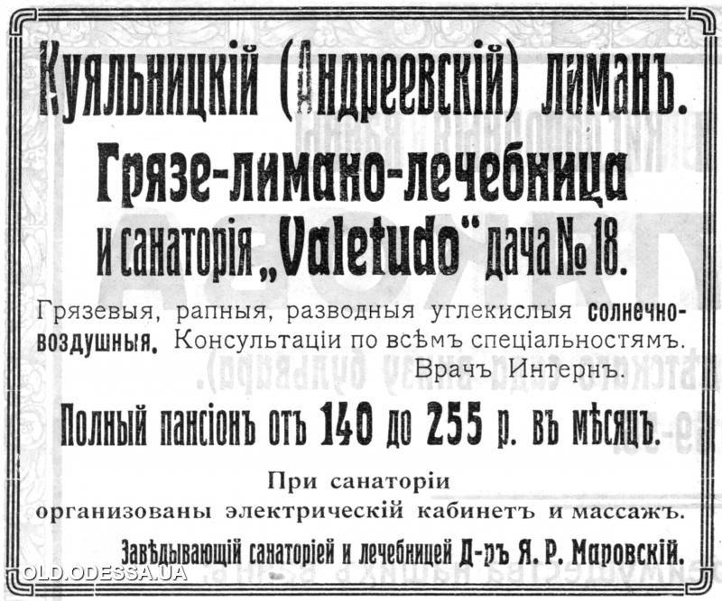 Санаторий «Валетудо» на Куяльницком лимане. Реклама в справочнике «Одесса-курорт». 1915 г.