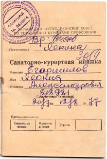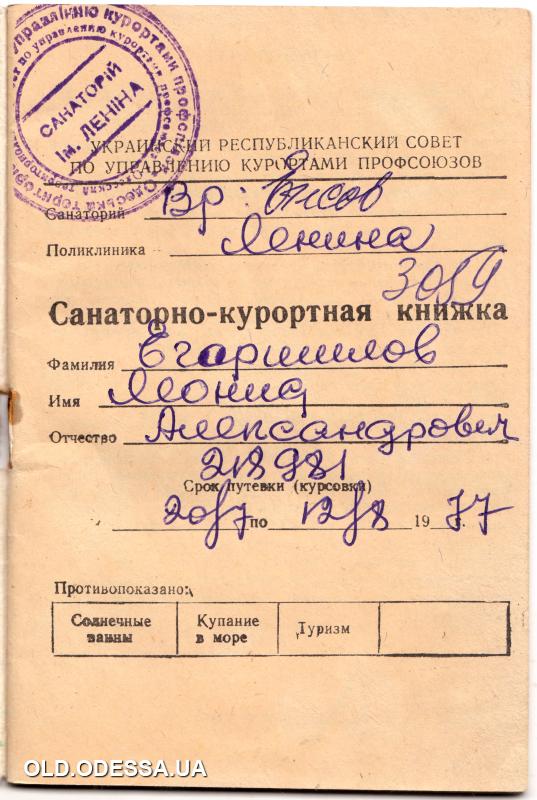 1-я страница санаторно-курортной книжки санатория им. Ленина. Одесса. 1977 г.