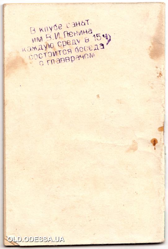 Последняя страница обложки санаторно-курортной книжки санатория им. Ленина. Одесса. 1977 г.