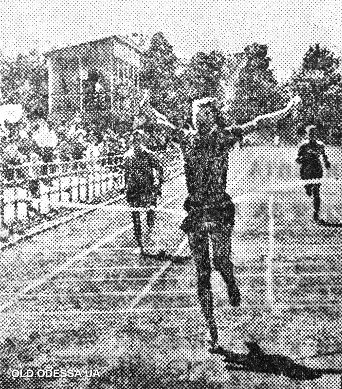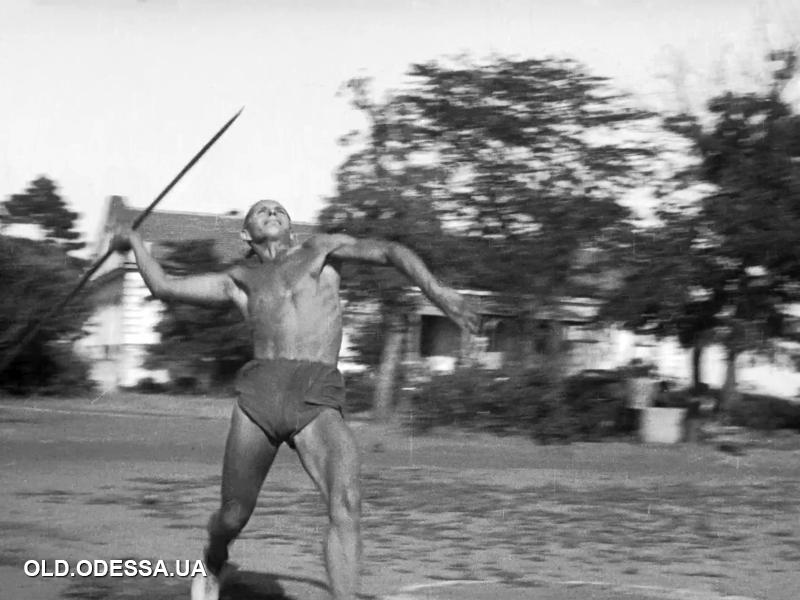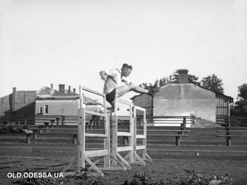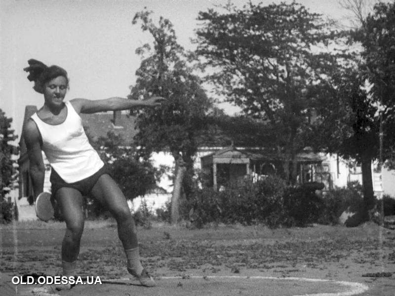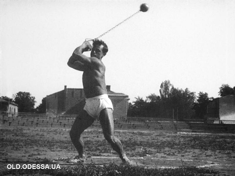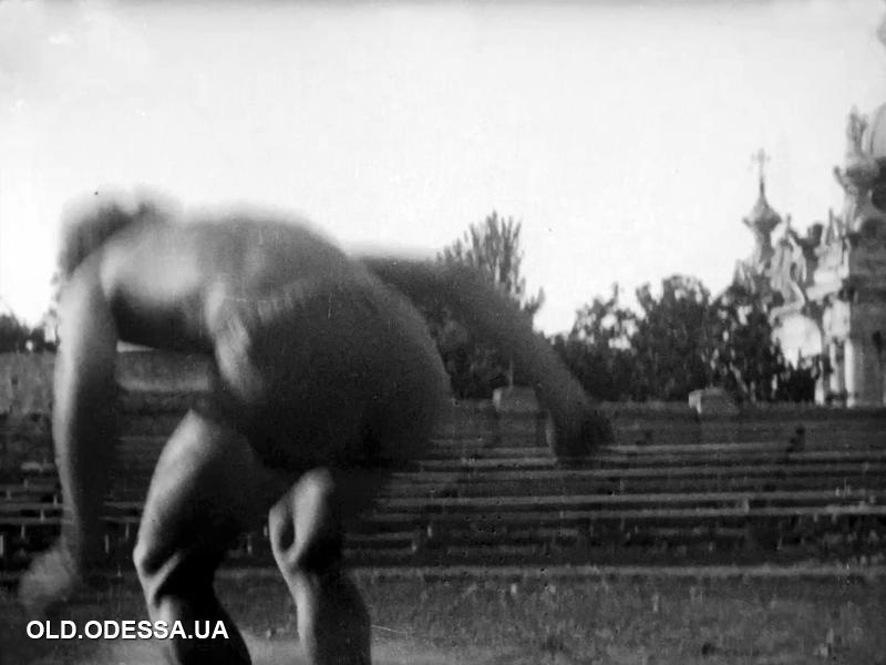 Тренировка на стадионе РКГ (профсоюза работников кооперации и госторговли) в Одессе. Справа видна церковь в Удельном переулке. Кадр из фильма «Человек с киноаппаратом». Снимался в 1928 г.