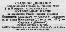 Анонс футбольного матча на стадионе «Динамо». Объявление в газете «Большевистское знамя». 05 июня 1946 г.