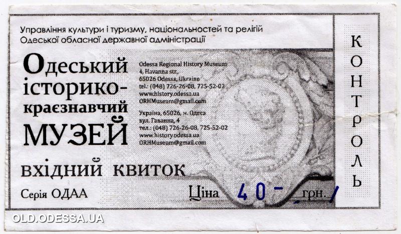 Входной билет Одесского историко-краеведческого музея, цена 40 грн.