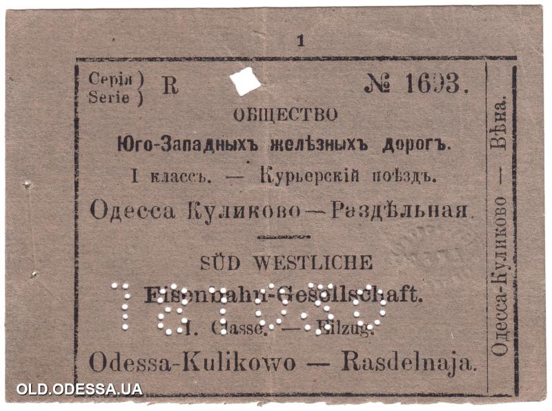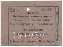 Билет Общества Юго-Западных железных дорог от Одессы до Раздельной. 1890-е гг.