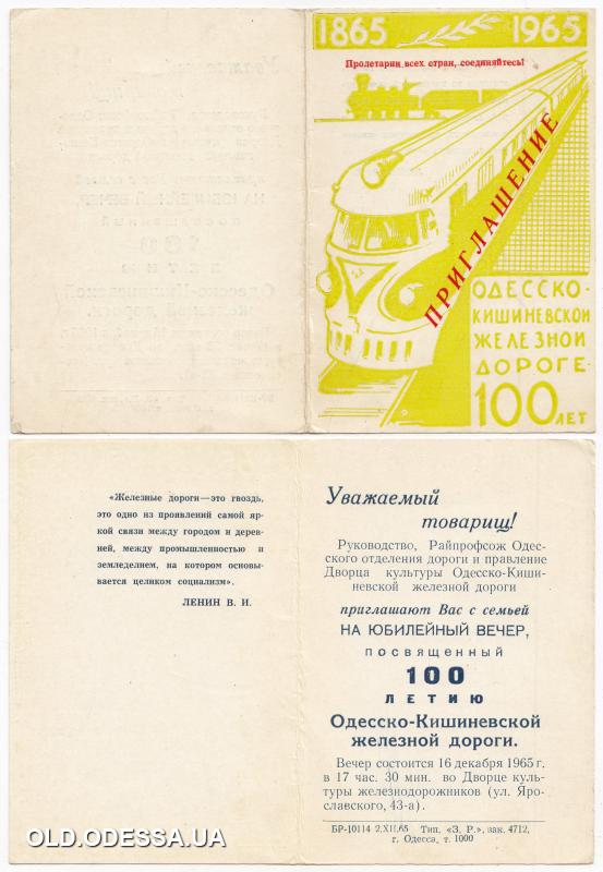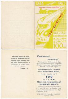 Приглашение на празднование 100-летия Одесско-Кишиневской железной дороги во Дворце культуры железнодорожников. 1965 г.