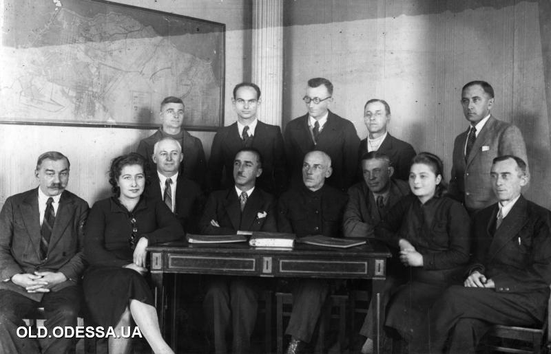 Коллектив инженеров, восстанавливавших дамбу. Фото в альбоме ««Восстановление дамбы Хаджибея». 1942 г.