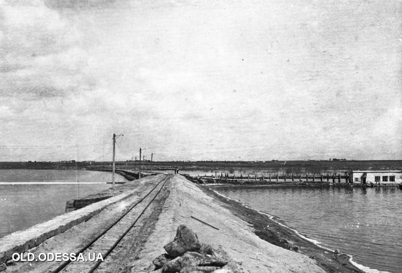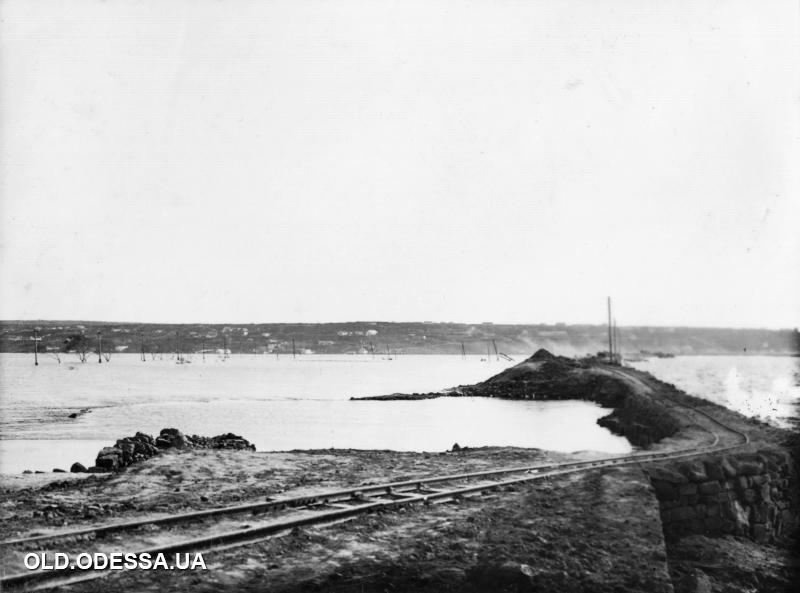 Общий вид затопления водами Куяльницкого лимана в станции «Сортировочная» ж.д. «Одесса–Бахмач». Фото в альбоме ««Восстановление дамбы Хаджибея». 1942 г.